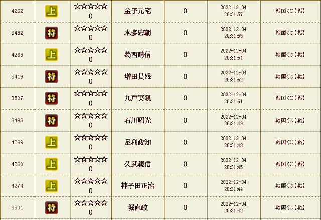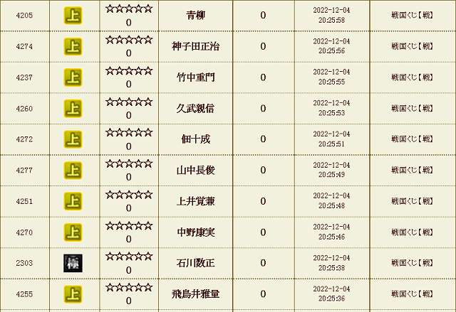 【IXA】戦くじ結果 2022/12 ゲーム 2023.05.04 リアルの都合で更新ペースが落ちてるのもあってなかなか進まず戦くじ結果はまだ2022年12月・・・半年(期)遅れだけは避けたい今日この頃。まぁ別に需要あるわけでもないので良いと言えばどーでも良いんでしょうけどね。全く引かない月もあったりしますが、先日の合成キャンペーンでの合成確率UP用の特武将目的で結構毎日ひいてたのでがんばって更新進めていかねばです。 戦くじ 試行回数合計 : 19,320 回 天 : 12 童 : 27 極 : 985 特 : 4832 上 : 13464