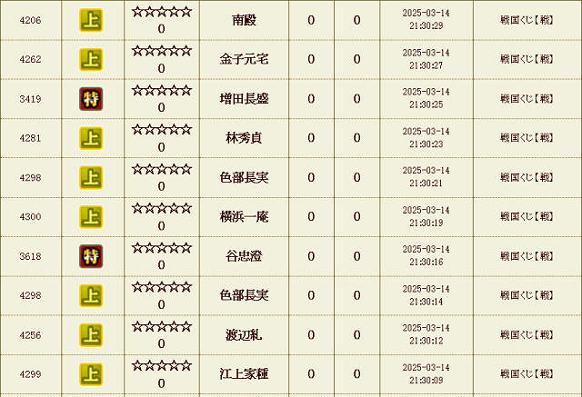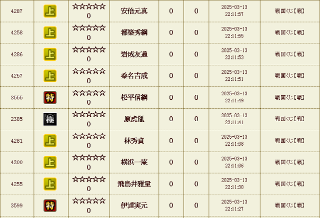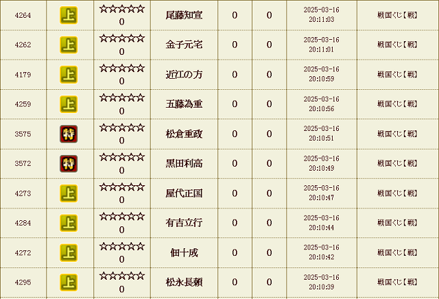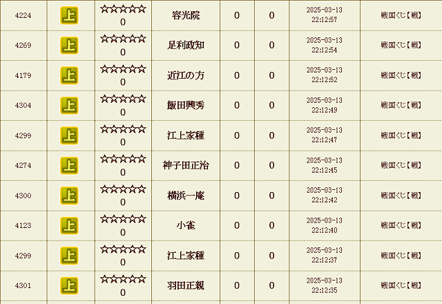 【IXA】戦くじ結果 ナダル決別…からの逆襲 ゲーム 2025.08.16 刷新から1週間経ちました。 いきなりですが、長年使ってきました この愛着のあった「ナダル」ですがきれいサッパリ決別し、まったくの別名で新しくスタートする事となりました。今期もぼちぼちよろしくお願いします。 ベタに速度部隊でも作った方がいいんですかね。 前回に続いてまたもオールイエロー ・・・が更に2連発?! 溢れる上武将がとまらない。 戦くじ 試行回数合計 : 24,180 回 天 : 17 童 : 33 極 : 1206 特 : 6055 上 : 16869