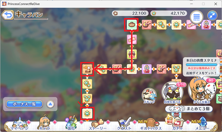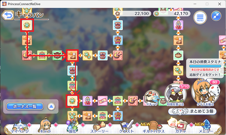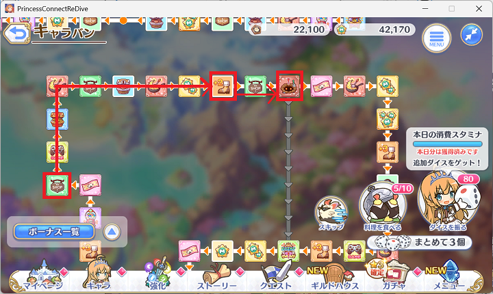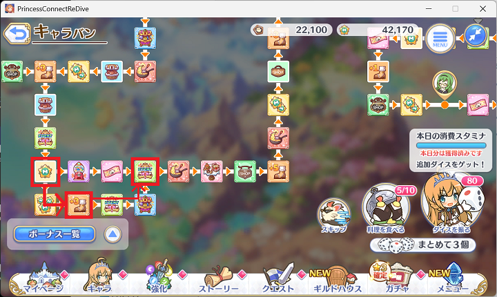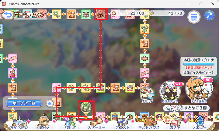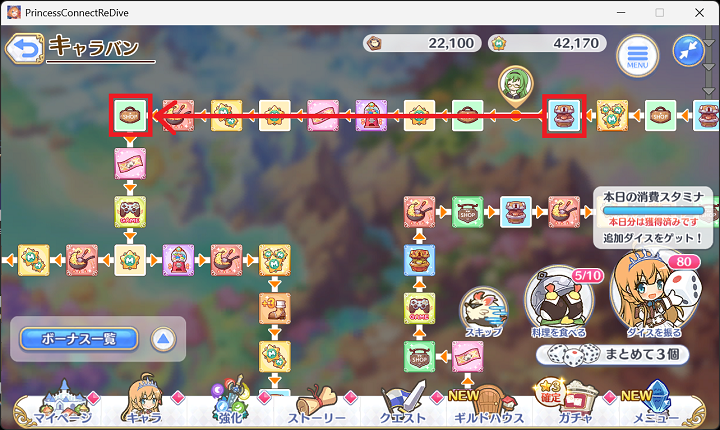 とりあえずマップを見てにらめっこし、手持ちの料理と相談し良パターンを模索、、、