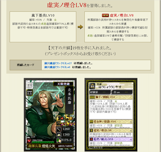 北条氏康についてたレアスキル・嵐下墨炎を保護+卓越マネが同時でいける虚実ノ理合をつけて
