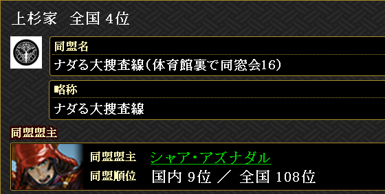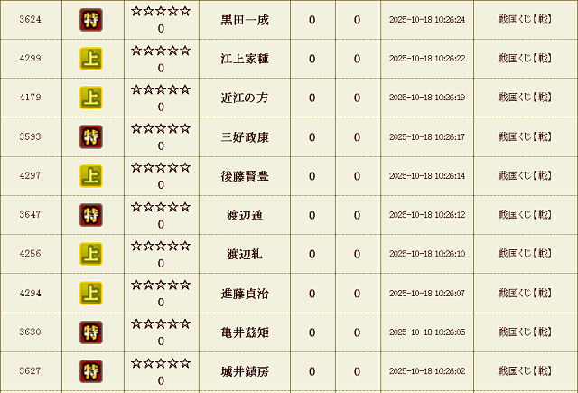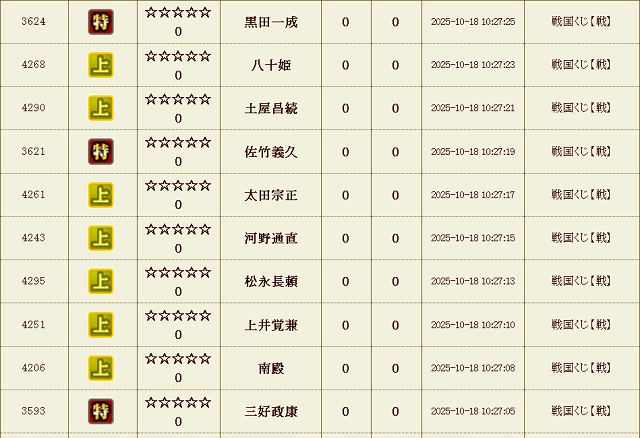 【IXA】戦くじ結果 今期のナダルは刑事物?! ゲーム 2026.02.08 31章 刷新しました。今期は上杉家でお世話になります。 同盟名、本当にもうネタがないんですが・・・ 今期はこれで、 キビシ――――――ッ!! (^^とうとう固有名詞を脱出し、動詞になったナダルを 今期もよろしくお願い致します。 ちなみに私、「踊る大捜査線」のドラマ?映画?? 見た事がございません。 戦くじ 試行回数合計 : 25,150 回 天 : 19 童 : 34 極 : 1258 特 : 6298 上 : 17541